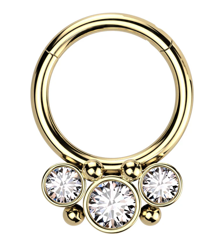 Gold PVD Triple Beaded Clear CZ Stainless Steel Hinged Segment Ring