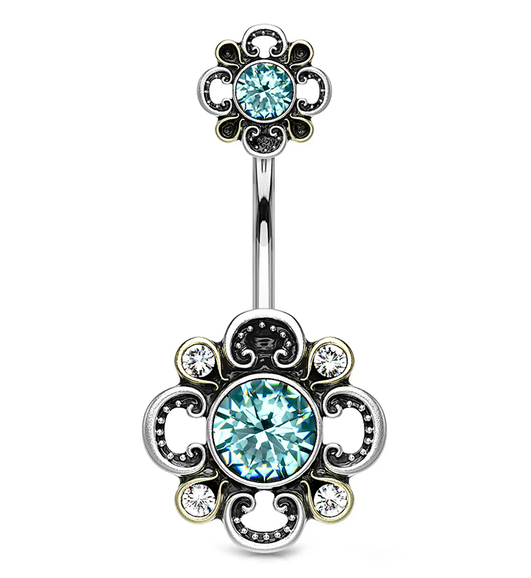 Aqua CZ Antique Flower Belly Button Ring