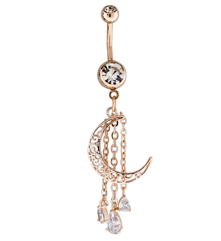 Rose Gold PVD Crescent Dangle Chain CZ Belly Button Ring