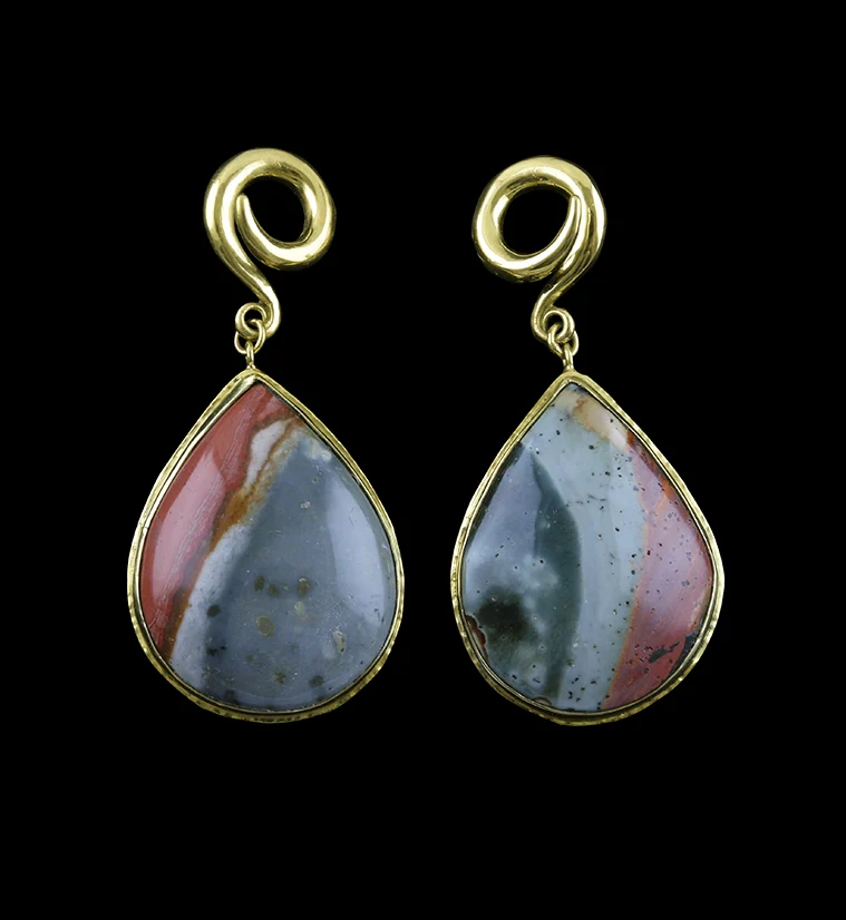 Teardrop Polychrome Ocean Jasper Stone Brass Ear Weights