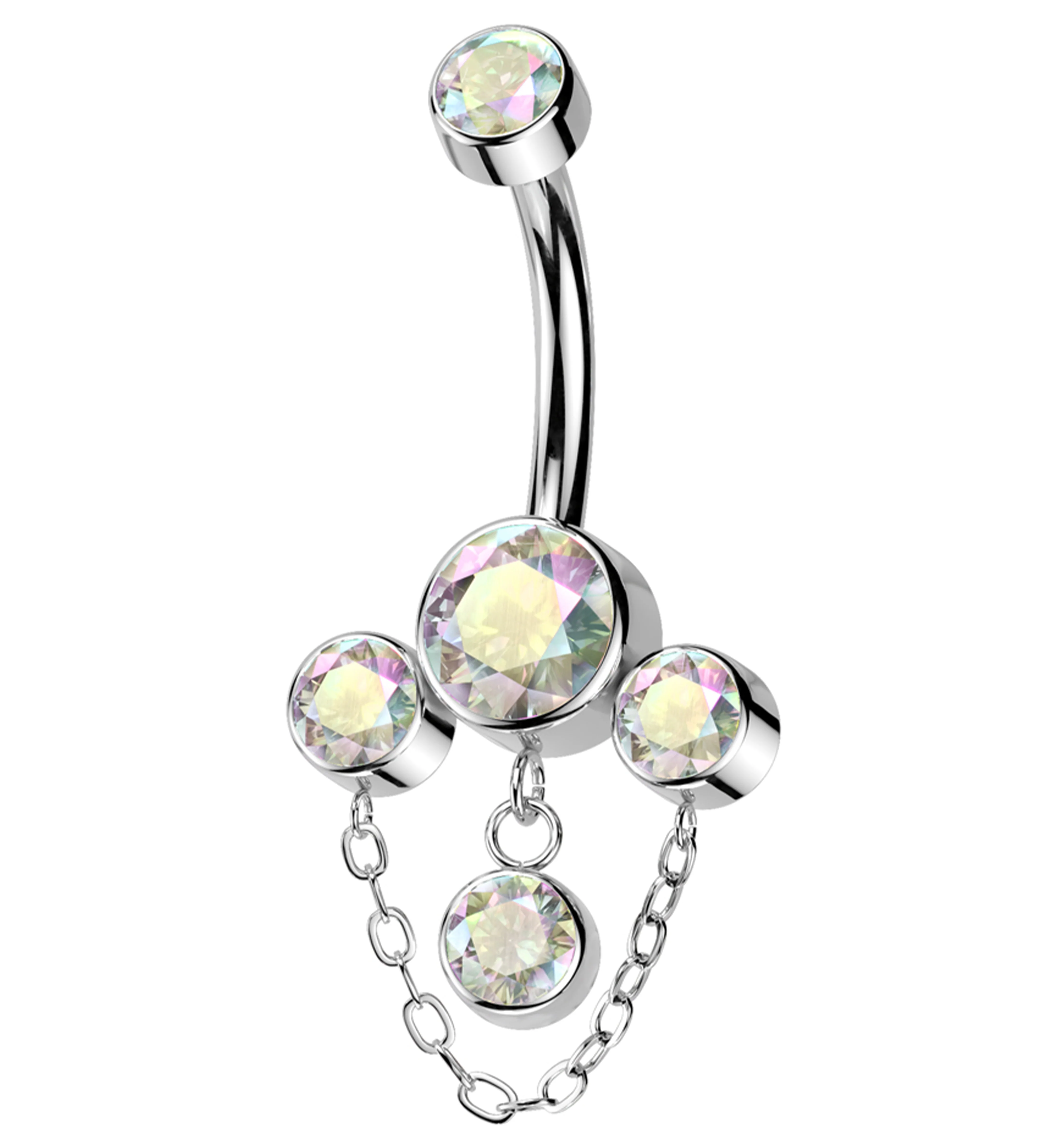 Triple Bezel Rainbow Aurora CZ Dangle Chain Titanium Internally Threaded Belly Button Ring