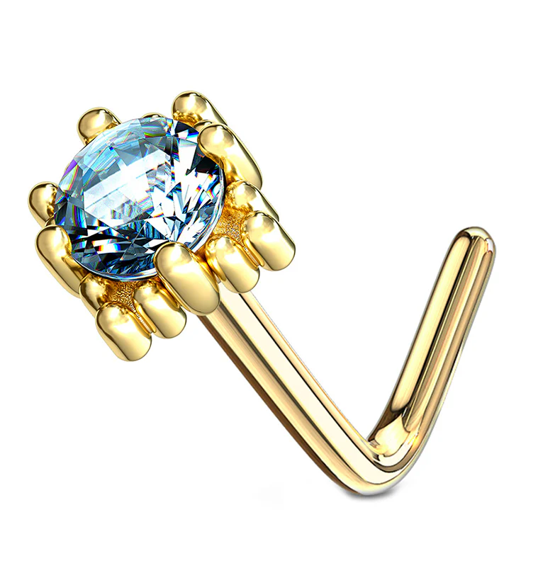 20G 14kt Gold Aqua CZ Floral L Bend Nose Ring