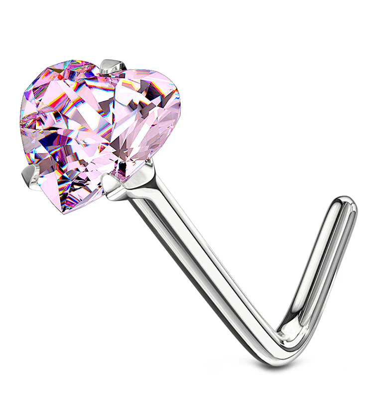 14kt White Gold Pink Heart CZ L Bend Nose Ring