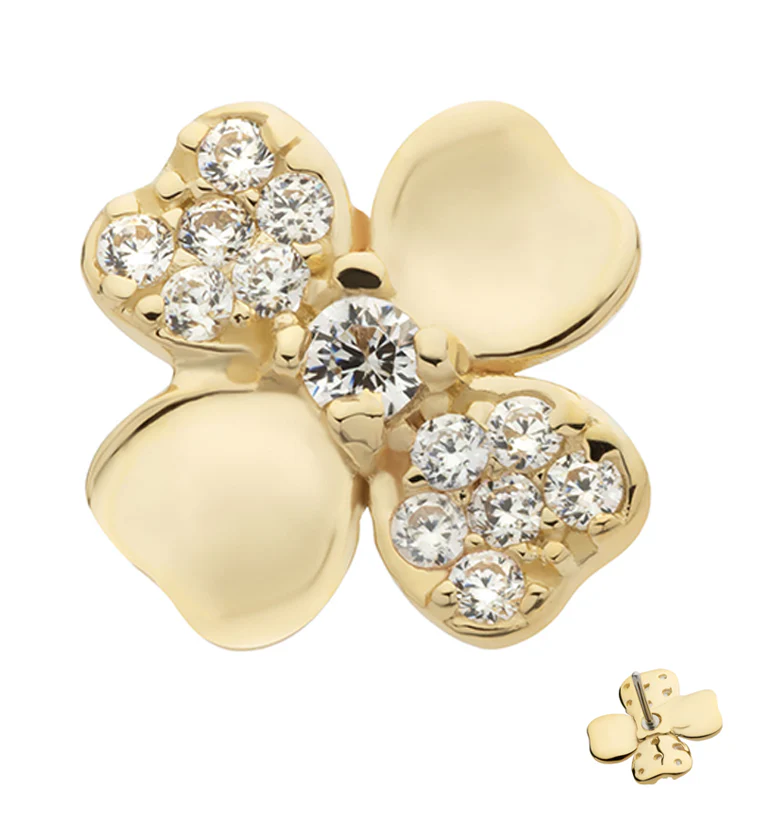 14kt Gold Four Leaf Clover Alternate Pave Clear CZ Threadless Top